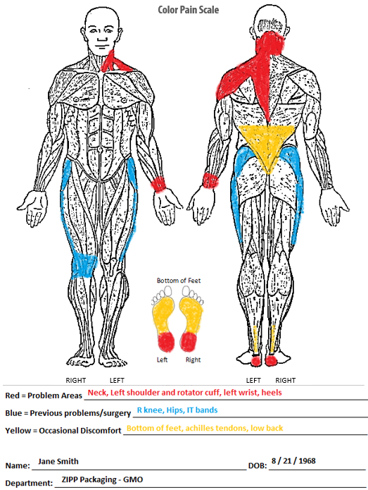 When AWS started on-site in January 2013, the Certified Early Intervention Specialist (CEIS) established an injury reporting system to help distinguish between “areas of pain” and “areas of tightness” in order to reveal chronic issues. This would involve individual, one-on-one conversations that allows the employee to discuss specific issues from the past and present. During this time, the employee colors in an anatomy picture to explain pain for the CEIS to evaluate. This reporting system helps the CEIS provide education on the body’s kinetic chain and integrate on-site therapeutic interventions. The form of “coloring your pain” helps to start conversations about job coaching, stretching benefits, and wellness changes. To keep employees accountable, the CEIS follows up with each person and continues to train them on various solutions. This department specific data will help support a new stretching program with a combination of static and dynamic exercises.