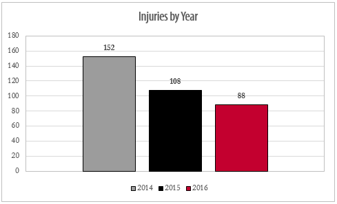 Recordable injuries have dropped from 152 to 88 (42% reduction)DART Rate has decreased by almost 50%, from 1.2 in 2014 to .62 in 2016.