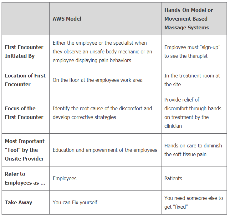 ATI Worksite Solutions™ (AWS) was a pioneer in the Industrial Athlete Early Intervention concept, with our first programs rolling out in 1995. While our program has evolved over the past 20 years, our core values and systematic approach remain the same: educate the employee on how they can keep themselves healthy and injury free, then hold them accountable. Only as this approach fails in full mitigation of discomfort, do we want our team members to be perceived as the “fixers” of the discomfort, through massage and other methods. Below is a comparative analysis of the AWS model vs Hands-On Massage based model.