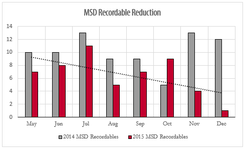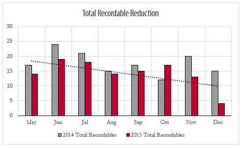 The number one goal of the AWS Early Intervention Program at this site was to reduce recordable injuries by 20%. This goal was achieved in 8 months. By February 2016, recordable injures were down 60%.
