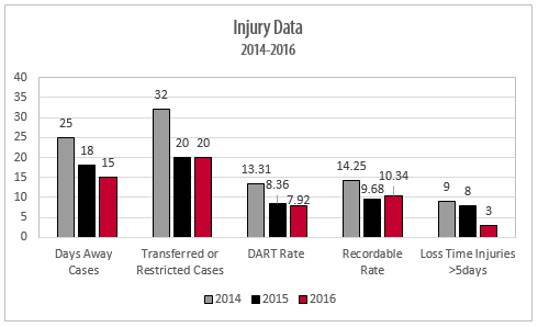 Prior to AWS coming on-site, the hub’s DART and recordable rates were some of the highest in the company. In 2015, the main objective was to decrease the DART rate and in 2016, the focus was to decrease loss time greater than 5 days.